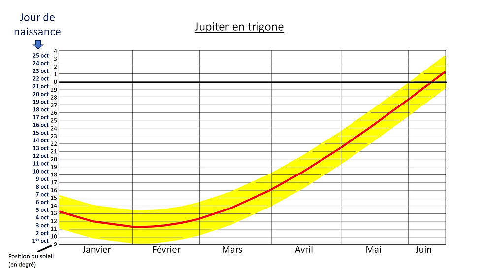 La ou les périodes en jaune sont celles où l'influence de la planète se fait sentir le plus fortement.